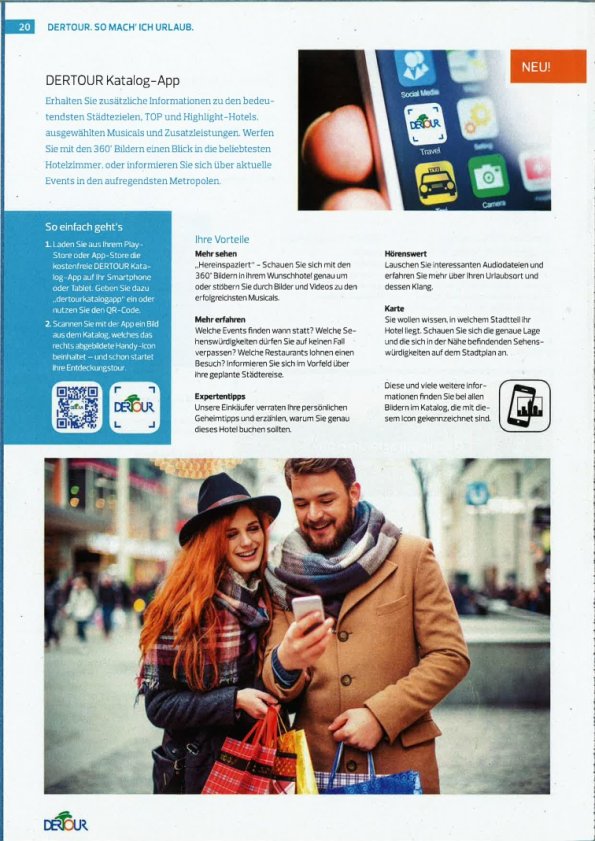 AUGMENTED PRINTDer neue DER TOUR Städtereisen Katalog ist nun zu haben.Ausgestattet mit unserer generischen Bilderkennung und der „No Touch“-Technologie Die „No Touch“-Technologie funktioniert nun wie beim QR-Code. Ein einfaches „Draufhalten“
