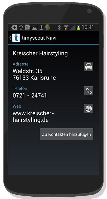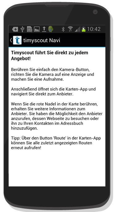 Timyscout NaviUnser Timyscout Navi bringt unsere Kunden direkt zum Anbieter. Das geht, indem wir Bilderkennung und Navigation miteinander verknüpfen: Wer eine Anzeige abfotografiert, wird auf eine Kartenanwendung geleitet, die den Weg vom Standort des Nutzers zum gewünschten Anbieter zeigt. Die Kontaktdaten lassen sich zudem im Smartphone speichern und die Navigation kann später und wahlweise von einem anderen Ort aus erfolgen. Zusammen mit der Röser AG und „Das Örtliche Karlsruhe“ haben wir unsere erste crossmediale Anwendung für Verzeichnismedien geschaffen: „Das erste Buch, das sprechen kann“. Detaillierte Informationen erhalten sie unter: www.my-timyscout.de
