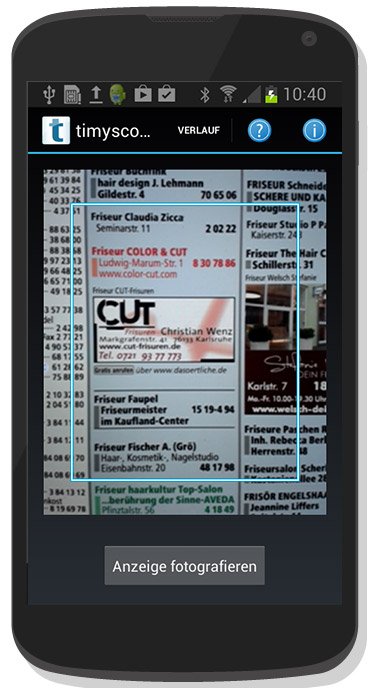Canny-App (timyscout Pro)Die Canny-App macht aus Ihrem Smartphone einen cleveren (canny) Wegweiser. Mit der Canny-App fotografieren Sie einfach eine Anzeige in „Unser Telefonbuch“ ab und erhalten sofort alle wichtigen Informationen zum Inserenten – egal zu welcher Zeit und an welchem Ort. Im Klartext: Die Canny-App fungiert als Verbindungsstelle zwischen Print und Neuen Medien. Detaillierte Informationen erhalten sie unter: www.my-timyscout.de  |